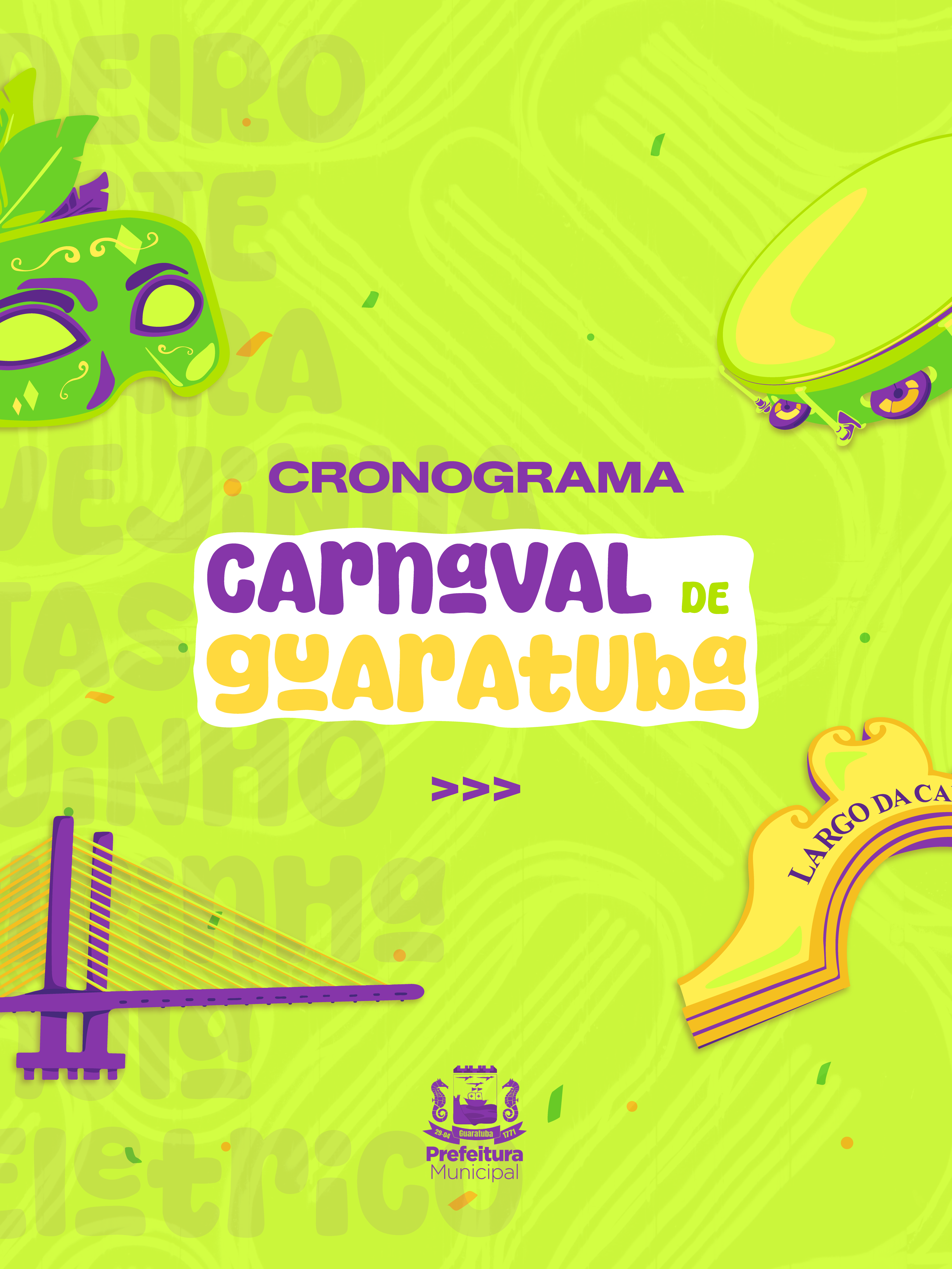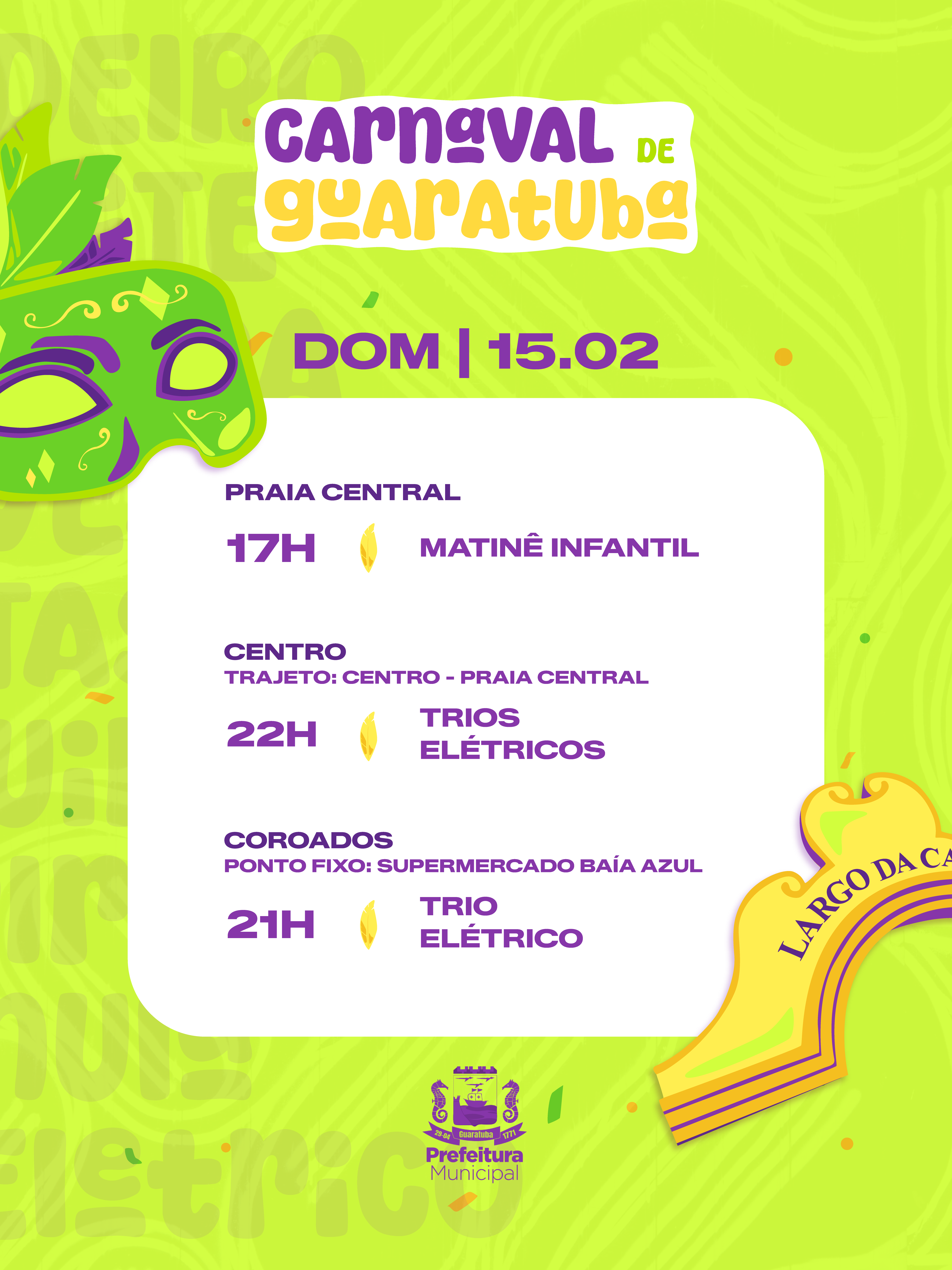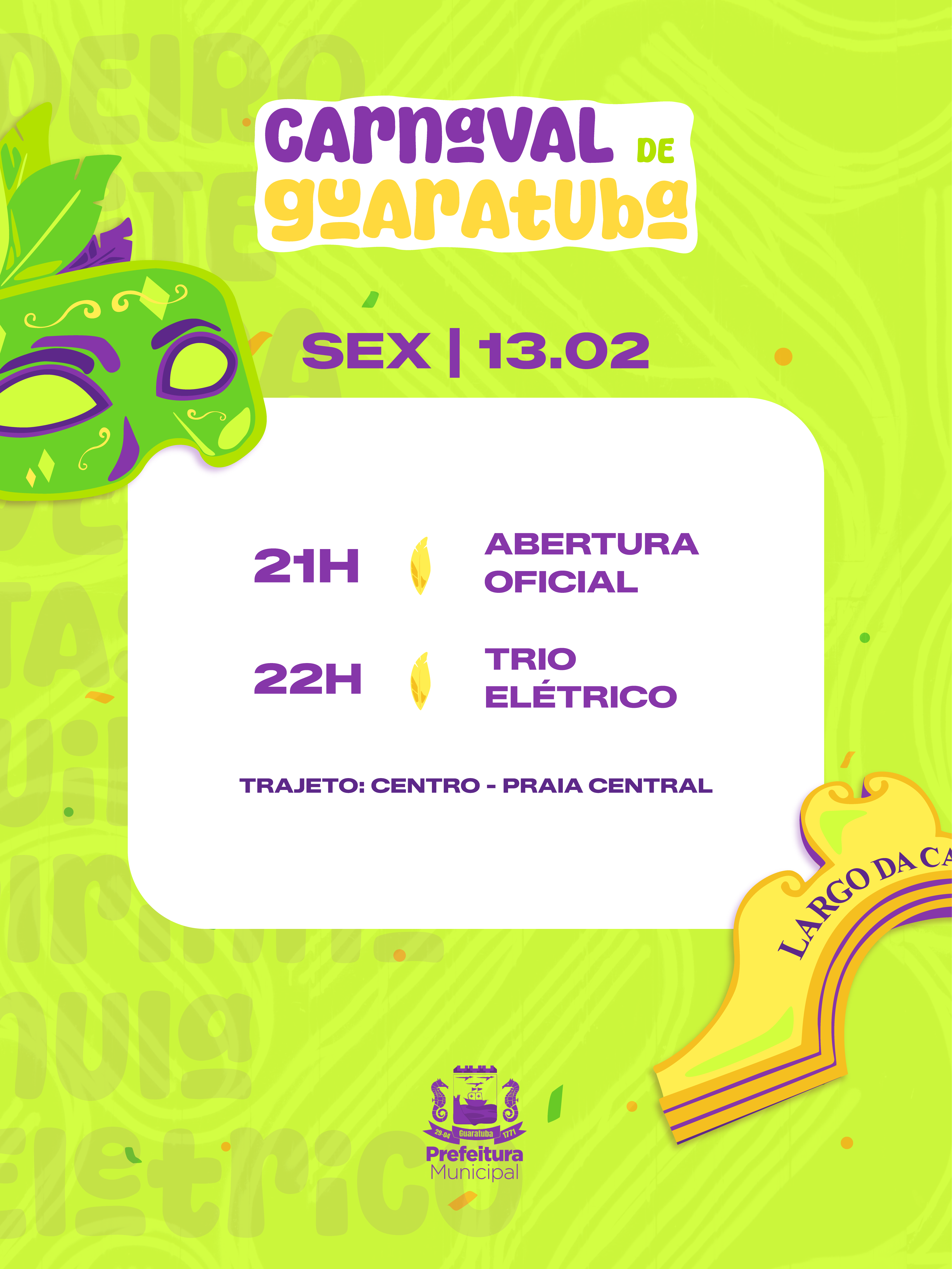 A abertura do Carnaval será na sexta-feira, 13 de fevereiro, e a programação segue até a segunda-feira de folia. Acompanhe a agenda completa nas redes sociais da Prefeitura de Guaratuba.